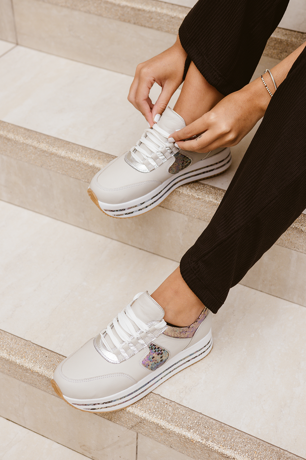 El material es por un lado beige con print dorado, y por el otro, blanco humo con print plateado. La plataforma de 4cm posee detalles con el cuero print en la plataforma.